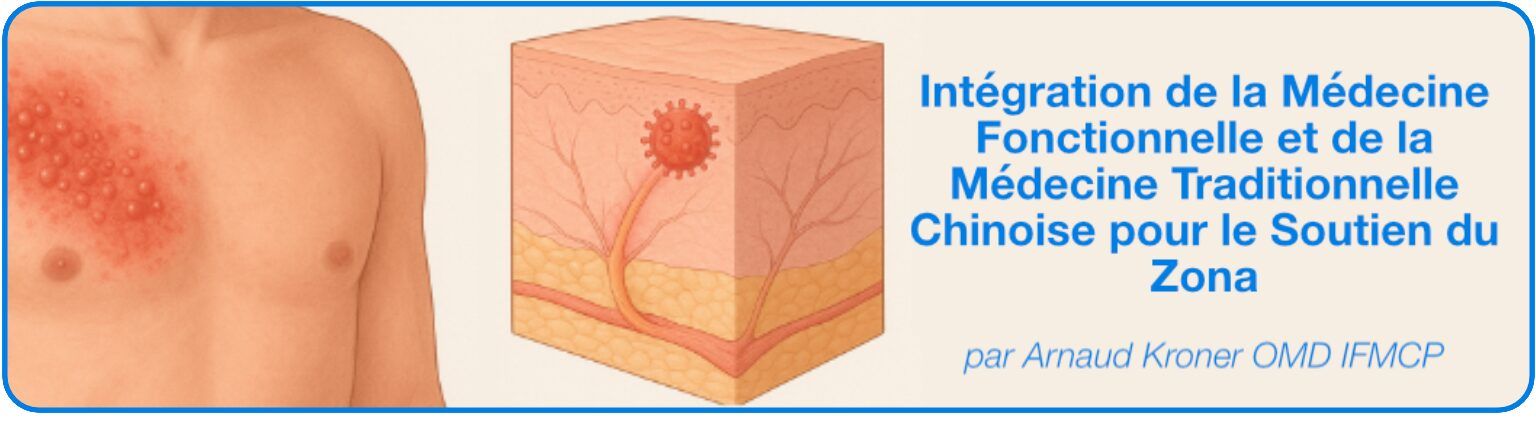 Le zona (herpès zoster) est une infection virale douloureuse causée par la réactivation du virus varicelle-zona (VZV) , le même virus qui provoque la varicelle. Une fois réactivé, le VZV migre le long des voies nerveuses jusqu’à la peau, provoquant une éruption cutanée caractéristique et souvent des douleurs intenses. Si le traitement conventionnel se concentre sur les médicaments antiviraux et le soulagement de la douleur, la médecine fonctionnelle et la médecine traditionnelle chinoise (MTC) proposent des approches distinctes mais complémentaires pour accompagner les patients, visant non seulement à soulager les symptômes, mais aussi à traiter les facteurs sous-jacents contribuant à la réactivation virale.