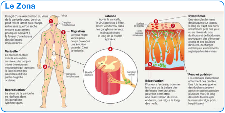 Le zona (herpès zoster) est une infection virale douloureuse causée par la réactivation du virus varicelle-zona (VZV) , le même virus qui provoque la varicelle. Une fois réactivé, le VZV migre le long des voies nerveuses jusqu’à la peau, provoquant une éruption cutanée caractéristique et souvent des douleurs intenses. Si le traitement conventionnel se concentre sur les médicaments antiviraux et le soulagement de la douleur, la médecine fonctionnelle et la médecine traditionnelle chinoise (MTC) proposent des approches distinctes mais complémentaires pour accompagner les patients, visant non seulement à soulager les symptômes, mais aussi à traiter les facteurs sous-jacents contribuant à la réactivation virale.